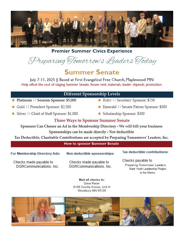 Sponsor Summer Senate Donate Using the PayPal buttons belowSelect from the sponsorship levels below, once selected, you will be redirected to PayPal to complete your transaction.Platinum || Session Sponsor – $5,000Gold || Presidental Sponsor – $2,500Silver || Chief of Staff Sponsor – $1,000Ruby || Secretary Sponsor – $750Emerald || Senate Patron – $500Scholarship Sponsor – $300
